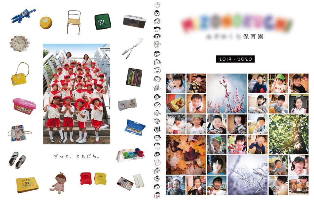 楽器やバッグ、文房具などの思い出のアイテムを配置することで、その園らしい日常の記憶まで表現されています。