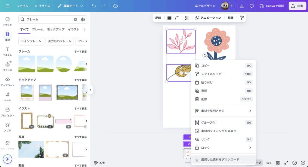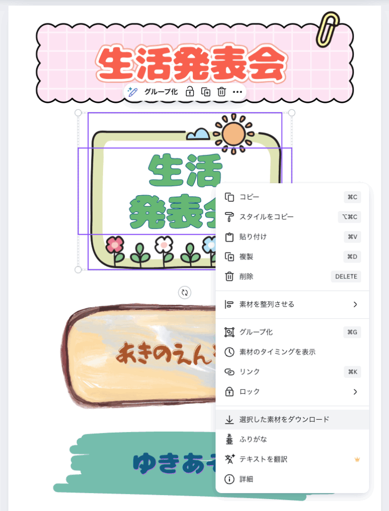 できあがった素材は、タイトル文字と装飾を同時に選択して右クリックすると、【選択した素材をダウンロード】が出てくるのでこれをクリックします。