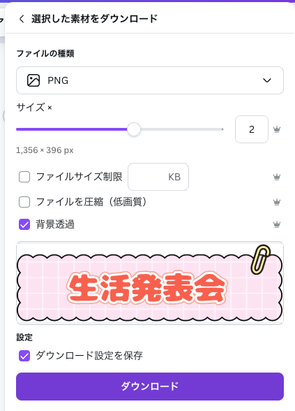 サイズ設定を『2』以上、【背景透過】に必ずチェックを入れて、ダウンロードをクリック。