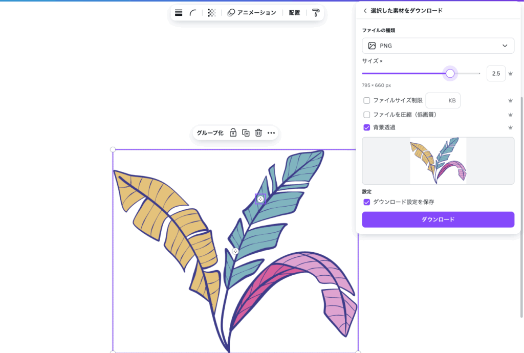 Canvaには素材単体をダウンロードする機能がありません。