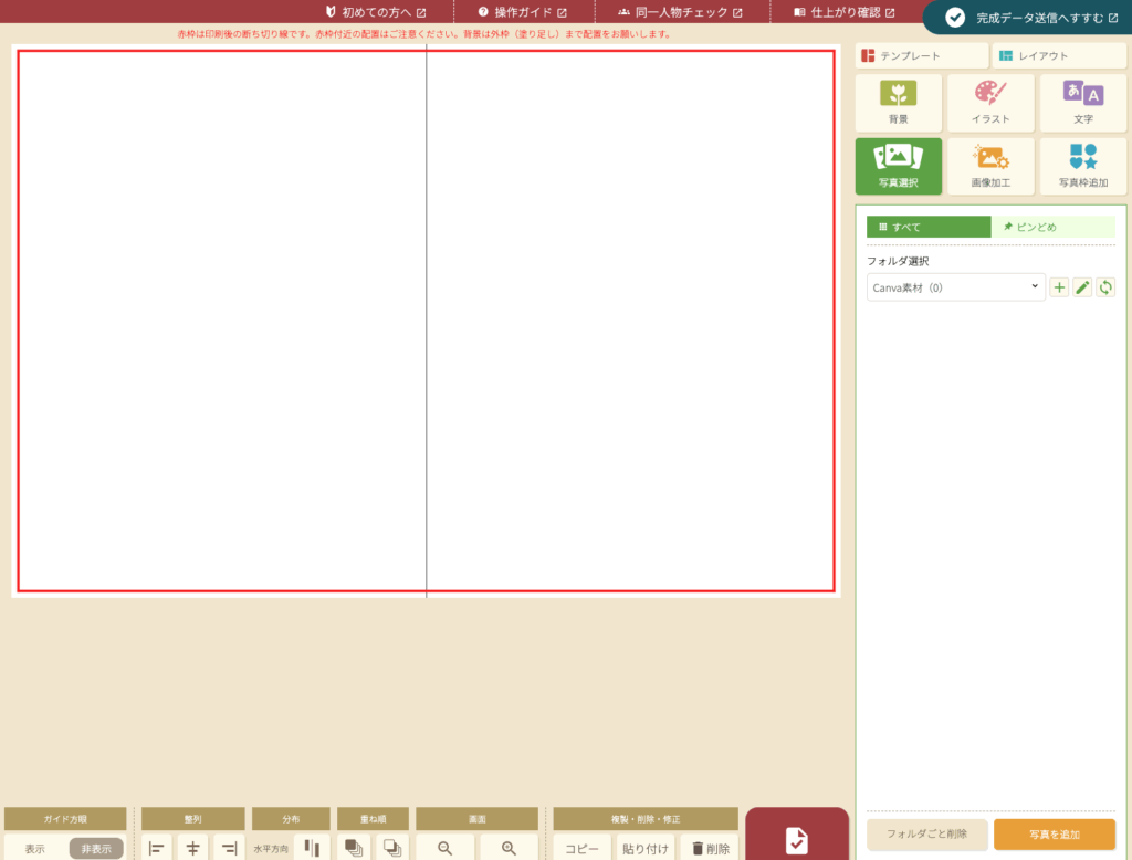 作った素材は写真として使いますので、【写真選択】メニューから、『Canva素材』というフォルダを作ってアップロードしていきます。