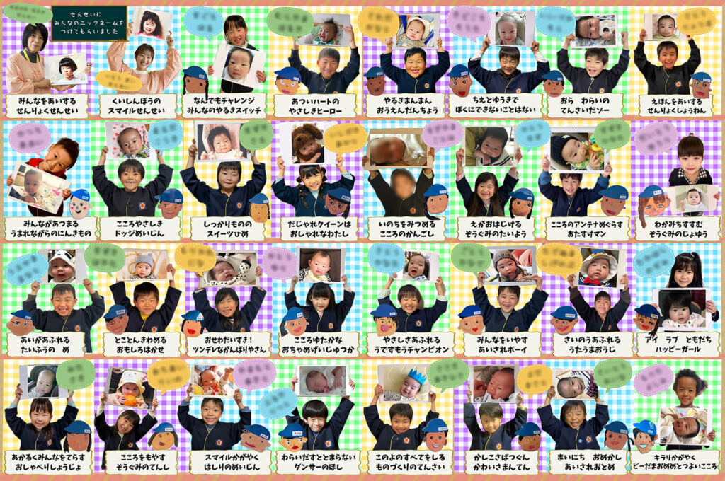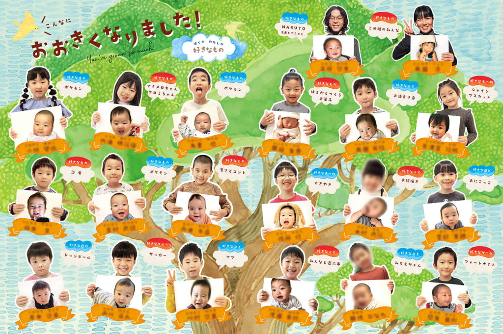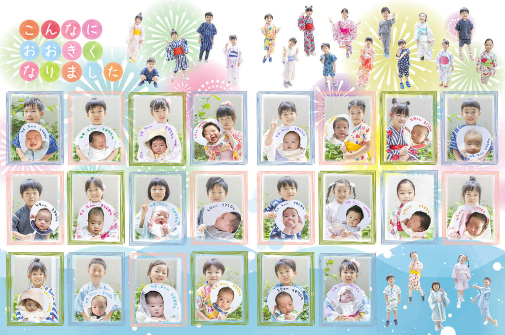 入園当初の集合写真と現在の集合写真を並べるなど、みんなの変化を見せる方法。 - 赤ちゃん写真を一覧にする