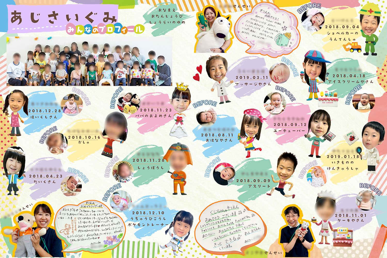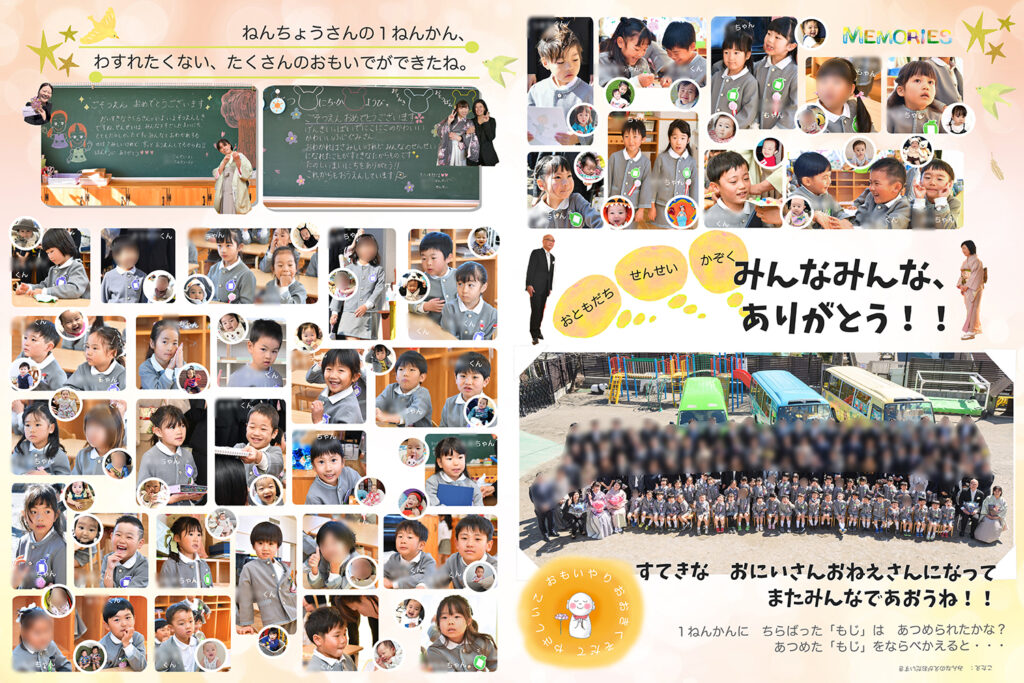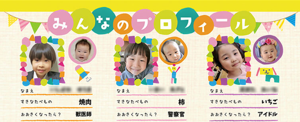 0歳 → 入園 → 年長など、段階的な成長を見せるレイアウト。 - クラス全体の成長で見せる