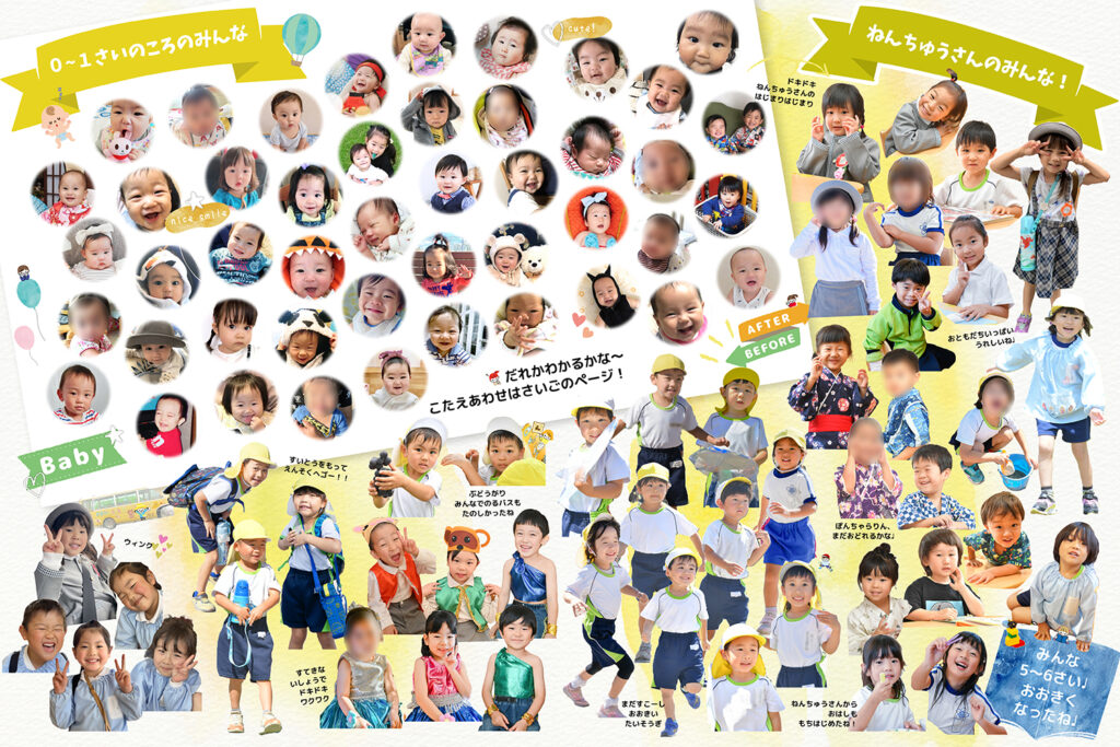 クラス全員の赤ちゃん写真を並べて「だれかな?」クイズのように楽しむページ。
